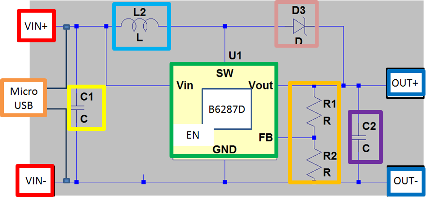 DCDC_ICを使って電圧を昇圧したい場合はシルク「U1」のICだけではなくインダクタンス・ダイオード・コンデンサ・FB抵抗が必ず必要となってきます。
