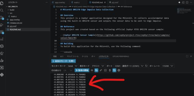 Edge ImpulseのCLI(Data Forwarder)等でデータを読み込ませる場合、このフォーマット崩れは致命的で、正しくデータが認識されません。