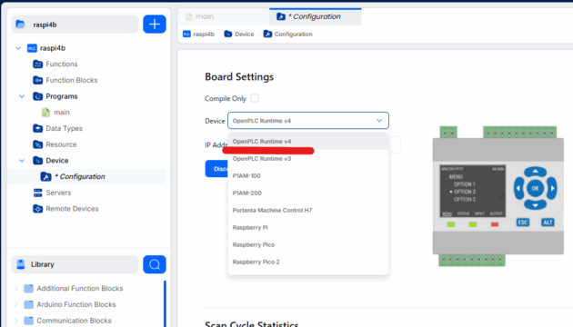 ConfigurationでDeviceの選択で、「OpenPLC v4 Runtime」を選択します