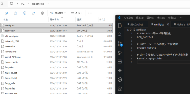 config.txtを下記のように編集して、ビルドしたzephyr.binファイルも入れます。