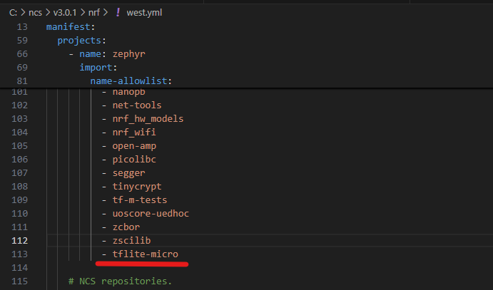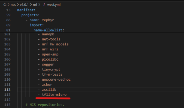筆者の例だと、C:\ncs\v*.* .*\nrf\west.yml の name-allowlist:にtflite-microを追加します