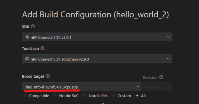 今回は、nRF ConnectでXIAO nRF54L15 Senseのボード向けにビルドしています